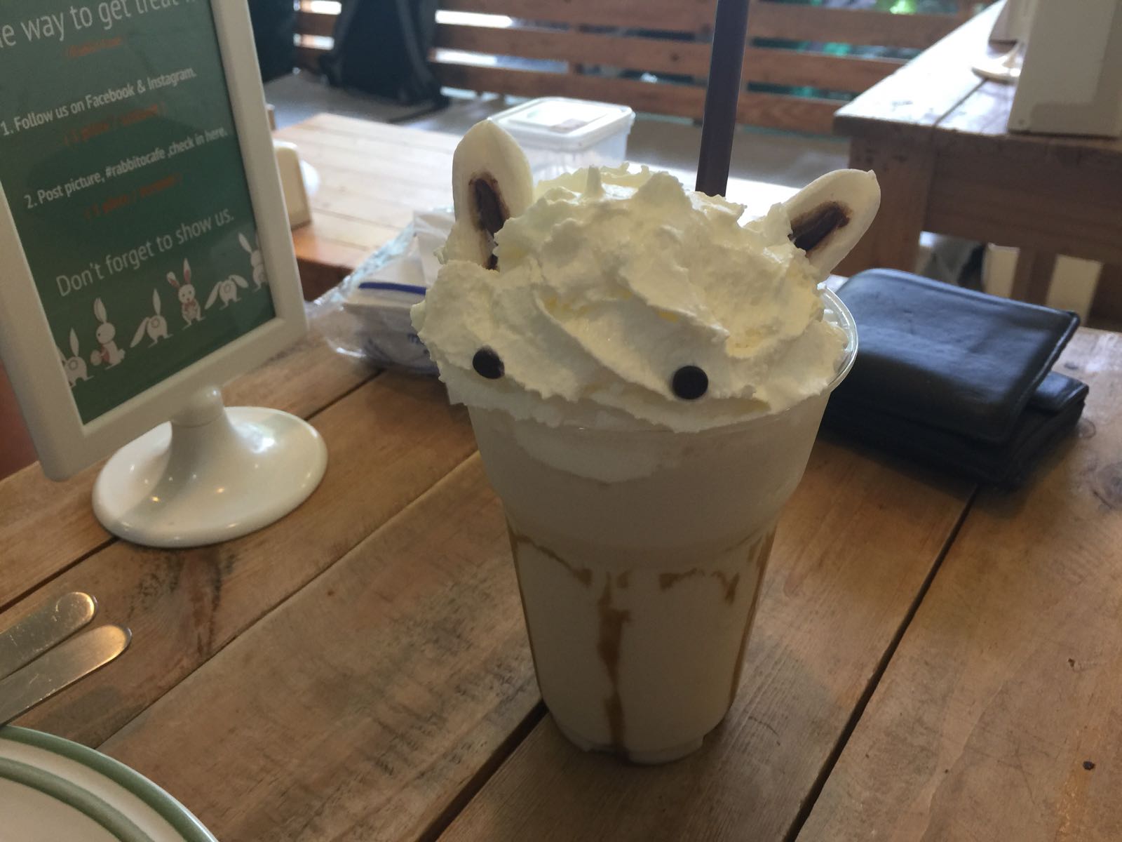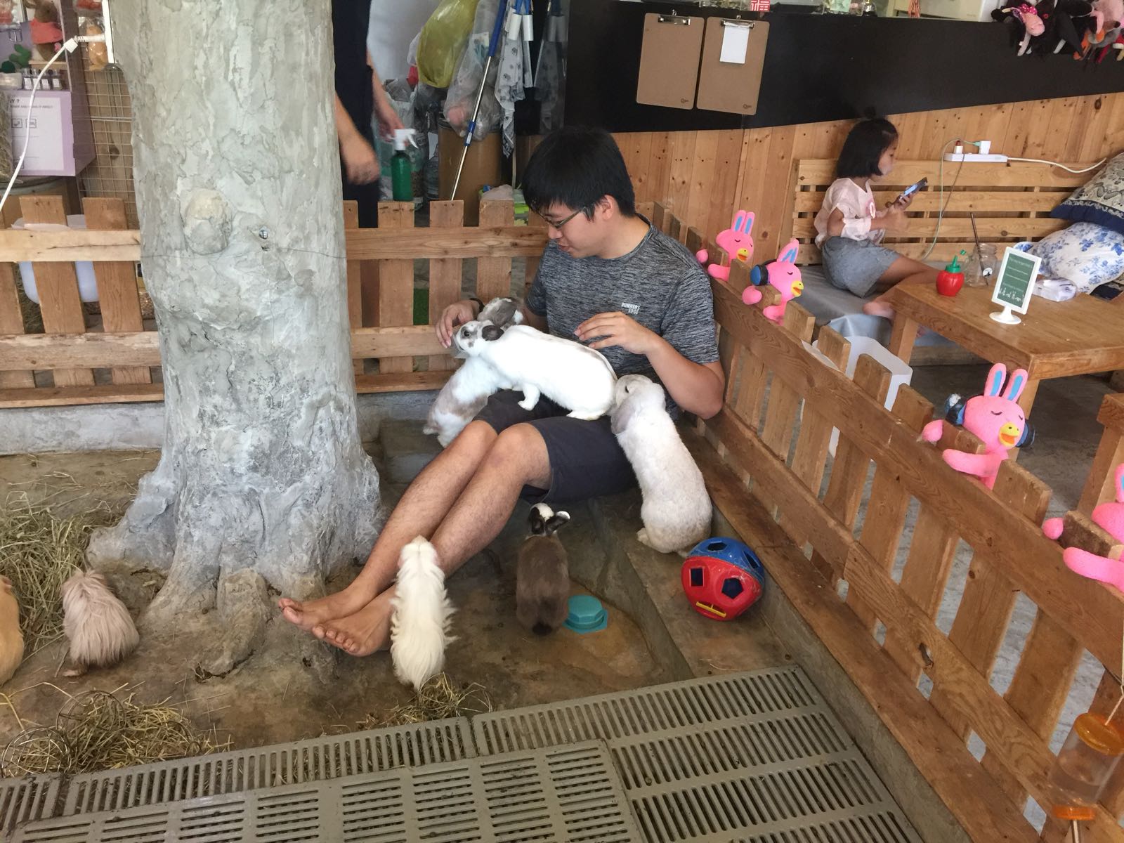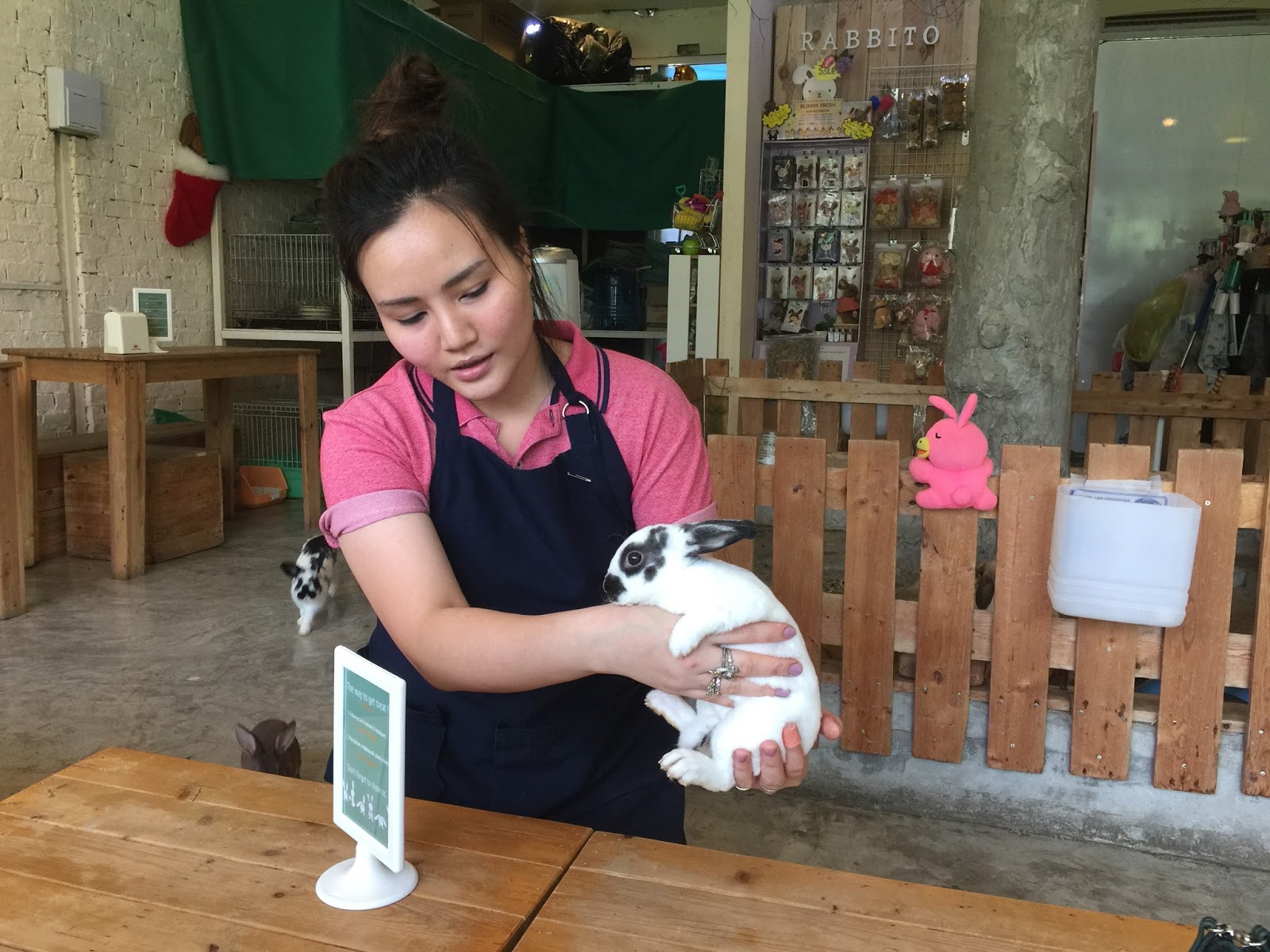 The staff were very attentive, kind and patient ensuring dear that it would be ok to enter the pan with the larger rabbits. They also advised us to eat at the higher benches so the bunnies could not get to our food. The sneaky fellows would climb onto your lap in hopes of getting to the food so do sit with your laps in a sloping position to discourage them from doing so.