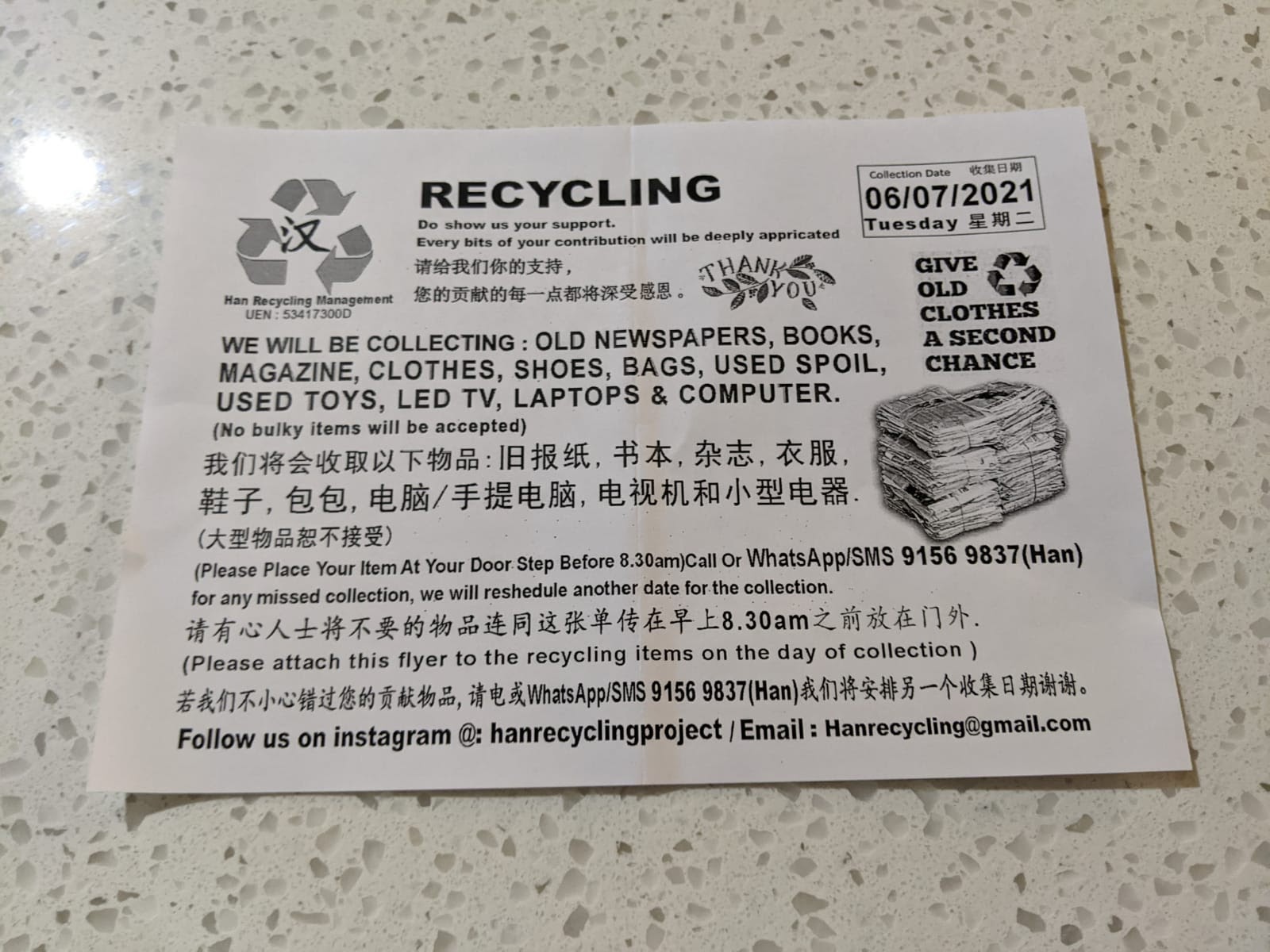 Should ever I see the flyer from Han Recycling Management again I will gladly give what I can spare, the true spirit of reusing and recycling is in making full use of what you already have. For greener earth, let’s all do our part and be a more caring and considerate society.