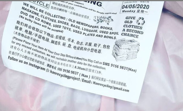 Due to the situation with covid-19 many thrift shops in my area have stopped collecting items but as luck would have it, I received a flyer on my gate from Han Recycling Management requesting old clothes, shoes, books, magazines, bags, luggage, plates and bowls. Normally I would just ignore such flyers as they usually are from scammers who pose as a recycling company or charitable organisation. These individuals would throw away our recyclable items in the trash and take only what was of value to sell.