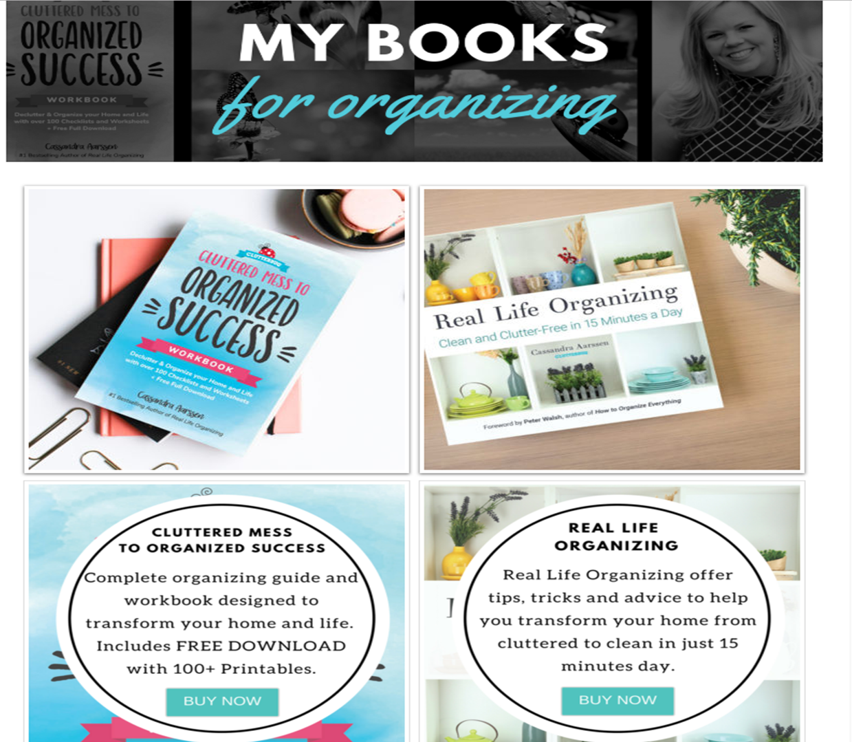Books are written by Cassandra Aarssen – As mentioned above Cass has written 2 books titled Real Life Organizing: Clean and Clutter-Free in 15 Minutes a Day &  The Declutter Challenge: A Guided Journal for Getting your Home Organized in 30 Quick Steps (Guided Journal for Cleaning & Decorating, for Fans of Cluttered Mess). I have not gotten my hands on the books yet but I am really interested in making a  purchase once my apartment is ready.