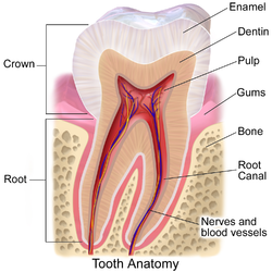 Let me start with the anatomy of a tooth; a tooth is made of many layers. The topmost layer is called the enamel. The enamel is the hardest part of the tooth. It is translucent, and you can see the light through it. The central portion of the tooth is dentine which provides the tooth with its natural colour, which may be grey or yellowish, so our teeth are not naturally white but come in various shades.