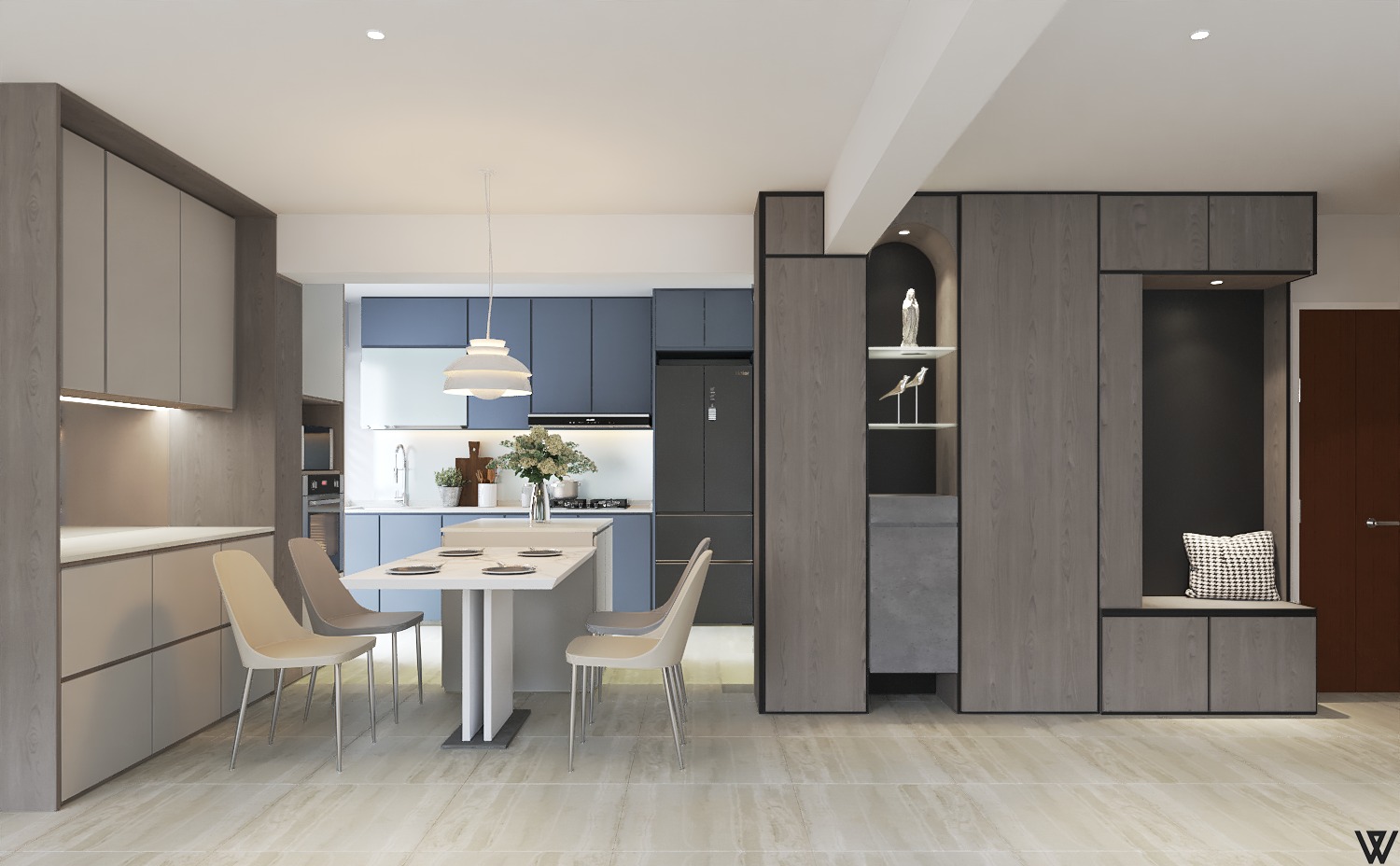 Modern Scandinavian apartment – I love the Scandinavian style homes while dear preferred a more modern and edgy look so we compromised and settled for a mix of both designs. We love the colours grey and blue. We wanted a tranquil and minimalist space. At first, I was worried about the grey shades. There is a fine line between looking chic and turning out too gloomy, I am glad Hosen is an expert in colour coordination, all the colours blended well with each other contributing to a seamless flow between the living room, study, kitchen and bedrooms.