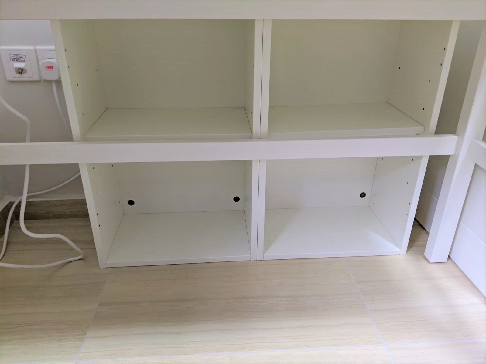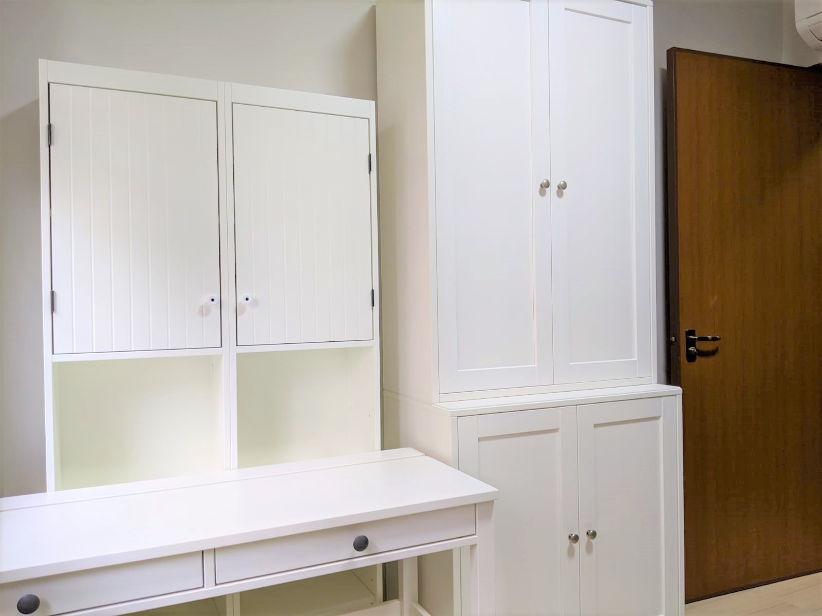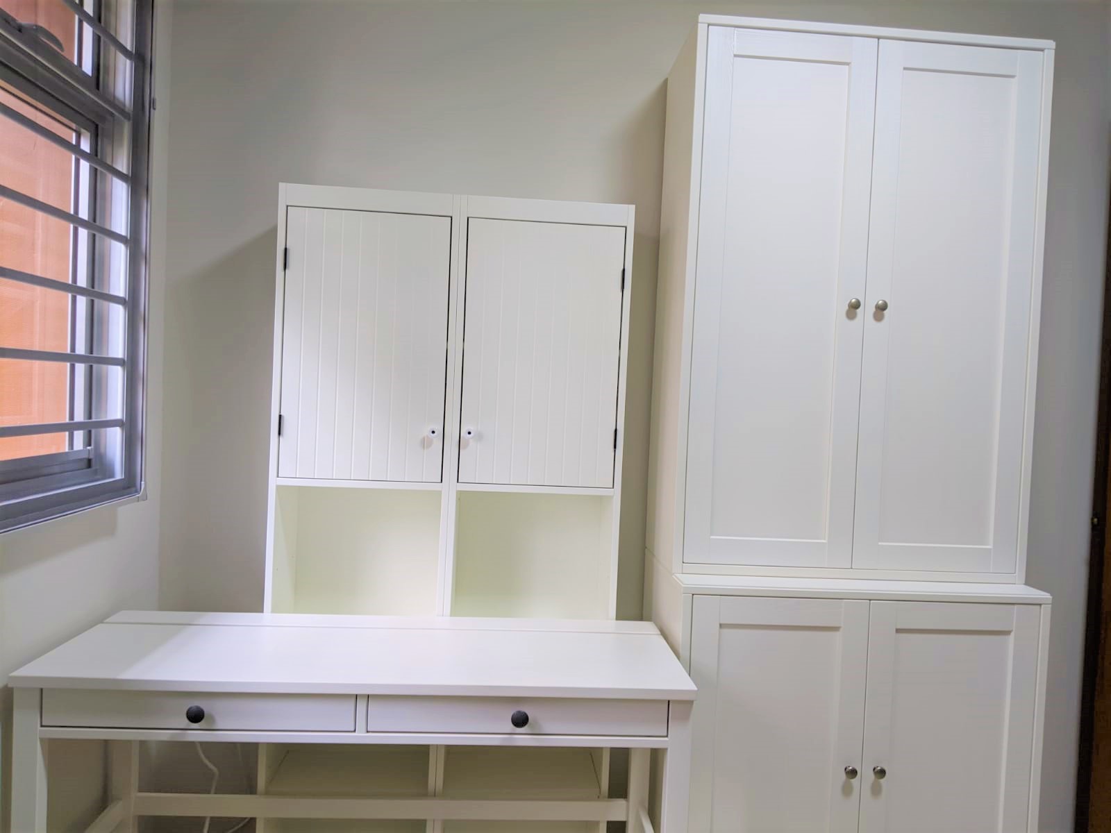 They were surprised about my Ikea hack idea and said Madam these Silveran High Cabinets are meant for the bathroom. I told him I knew but I want to use them as bookshelves instead. I also instructed him not to install the bottom two doors or the legs of the cabinet as I would be placing the HEMNES desk in front of the cabinets and still wanted to be able to store items under my desk to maximise the use of the space.