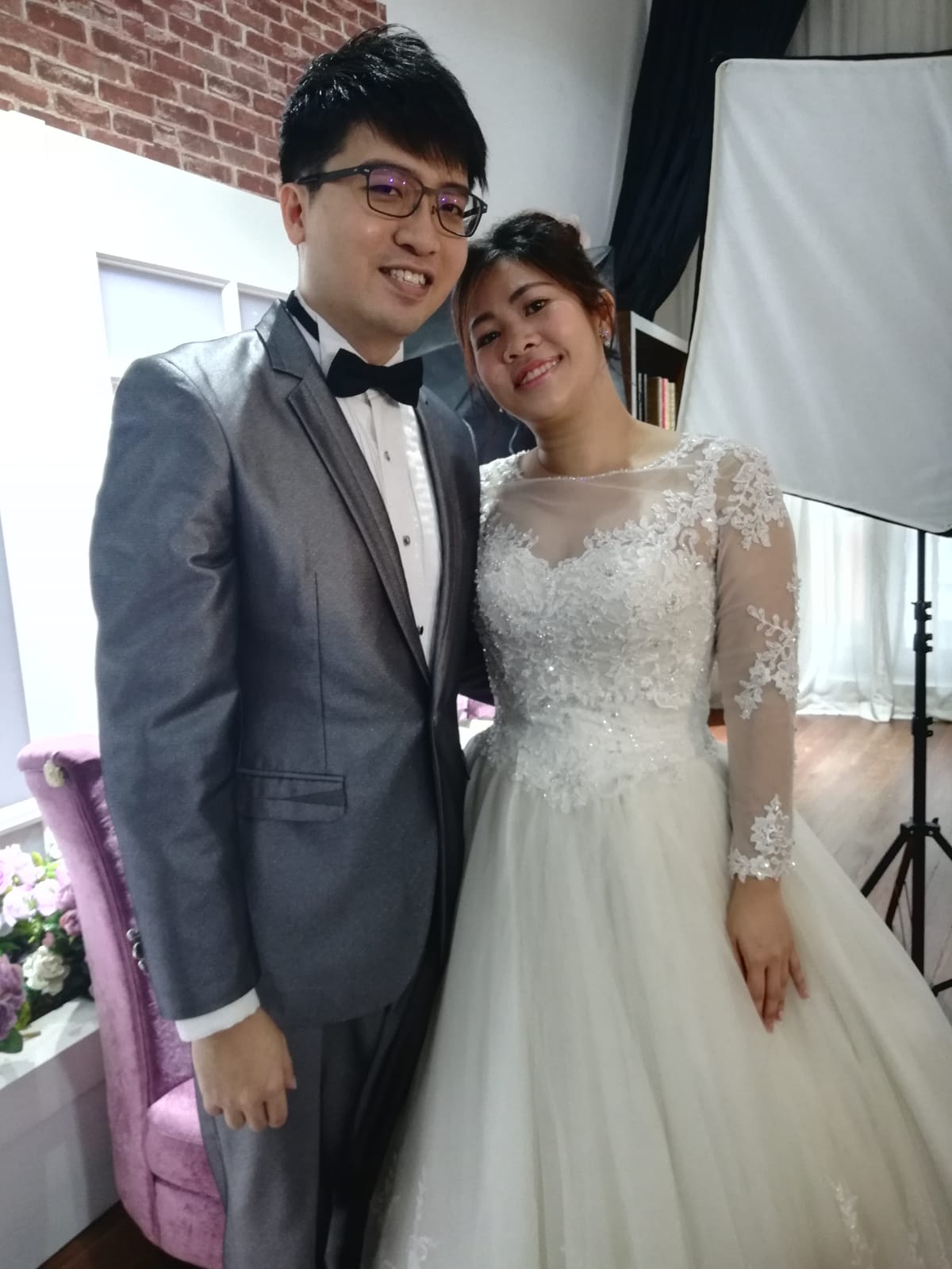 Due to the heavy downpour, we opted to do our studio shoots first, the 3 story shophouse had many props, and we had to go to 2 different levels for different backgrounds and furniture. Christine helped me changed into different gowns. She also styled dear’s hair and ensured his suit was neat.