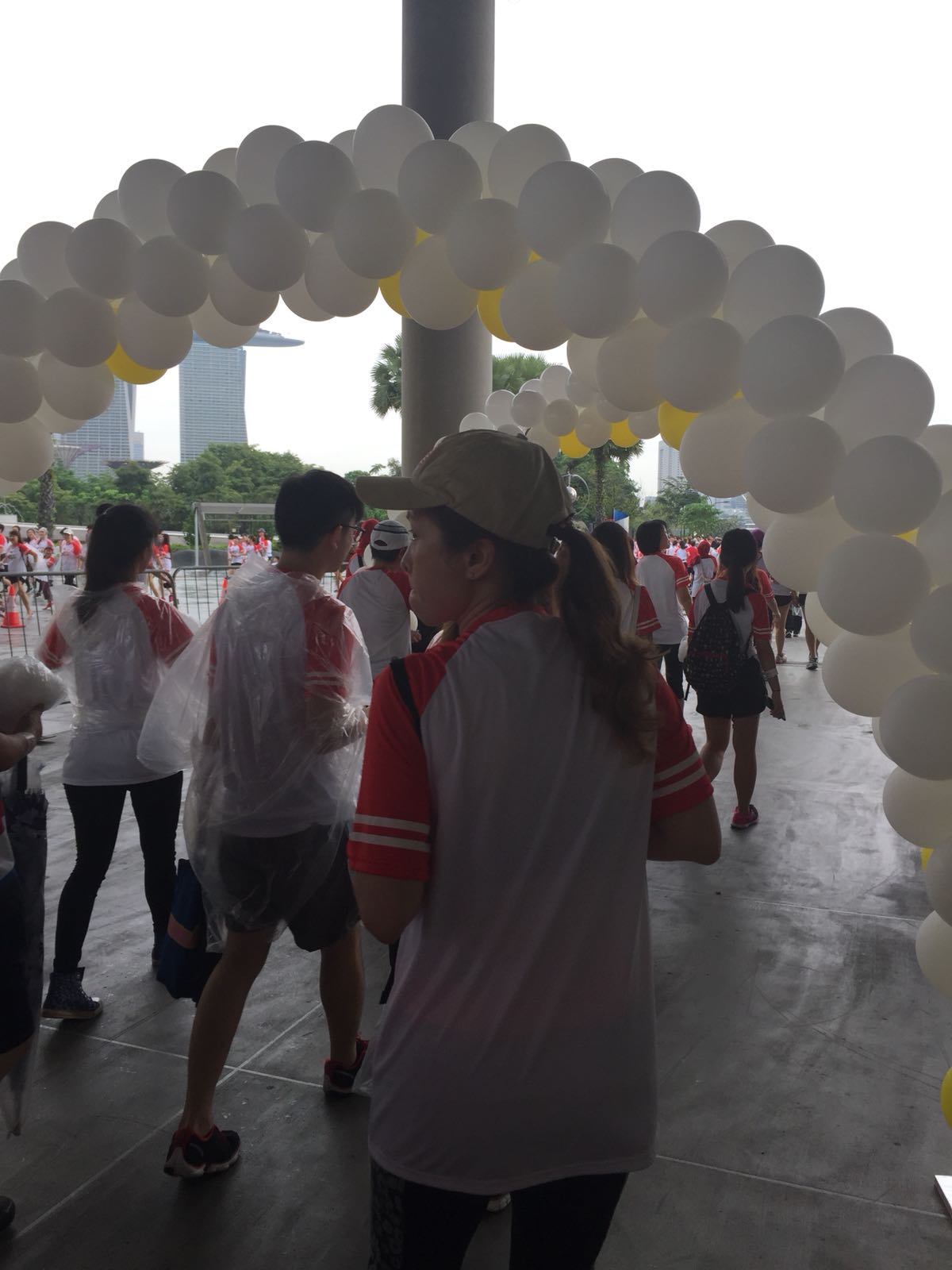Running in The Rain – My friend and I reached The Promontory at Marina Bay at 7:30 am and were part of the first flag-off at 8:35 am, it was light rain, so we were advised by the organizer to walk instead of the run due to the ground being slippery. A Hello Kitty Mascot made an appearance and the crowds cheered for her as she prances across the stage and danced. Undamped by the weather everyone was raring to go, many continued to jog the entire race while others walked with ponchos and umbrellas. Thankfully the skies did clear an hour into the race.