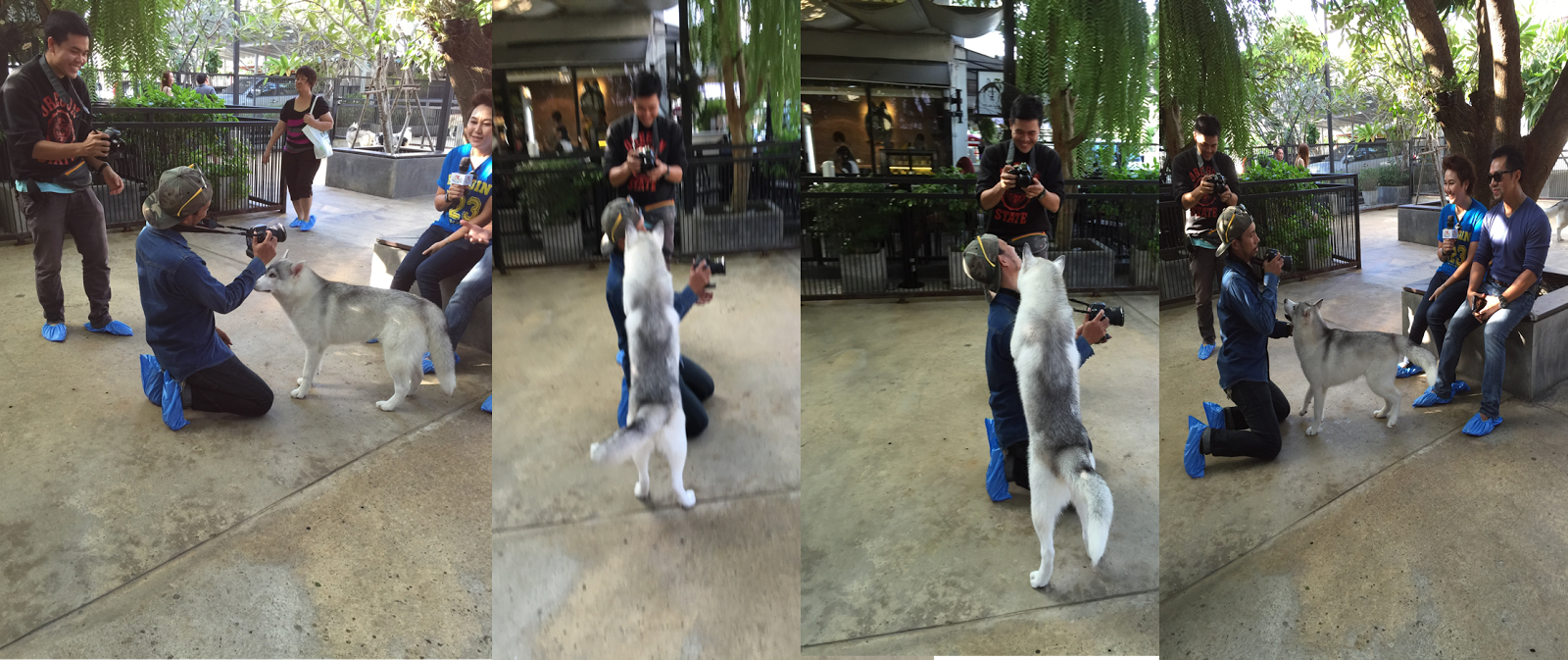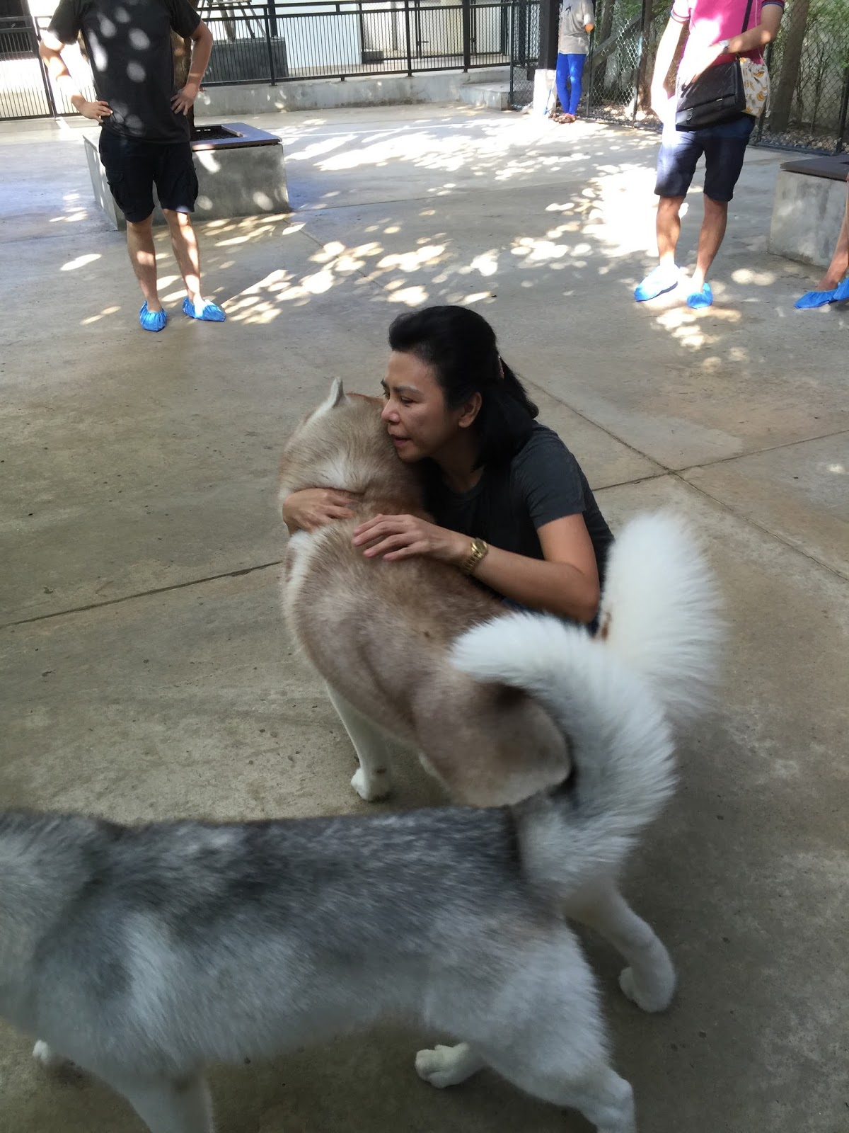 Amidst playing with the huskies, I noted one particular dog was drawn to the cameramen of a local television station. Licking and cuddling up to the poor gentleman who was trying his utmost best to focus on his job, filming the interview. He gently patted the dog and smiled. I guess the dog got the cue and snuggled beside the cameraman, looking disappointed.